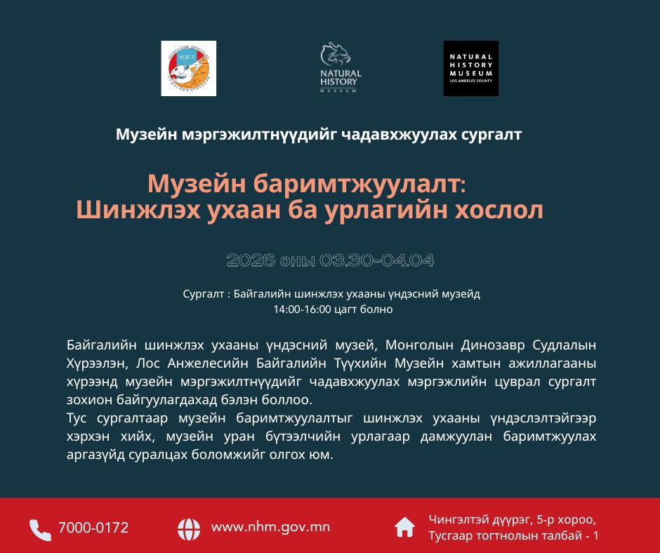 МУЗЕЙН БАРИМТЖУУЛАЛТ: ШИНЖЛЭХ УХААН БА УРЛАГИЙН ХОСЛОЛ МУЗЕЙН МЭРГЭЖИЛТНҮҮДИЙГ ЧАДАВХЖУУЛАХ СУРГАЛТ ЗОХИОН БАЙГУУЛАГДАНА