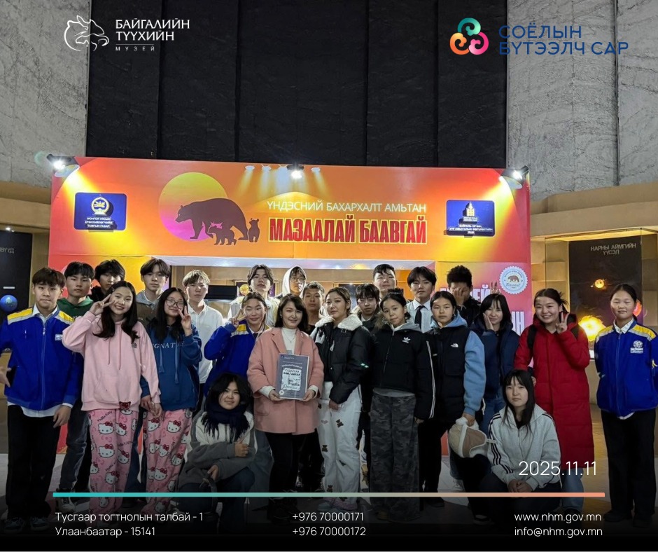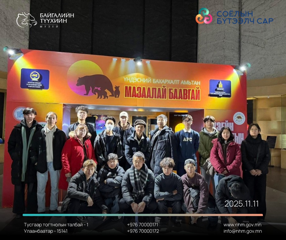 STUDENTS OF TECHNICAL AND TECHNOLOGICAL COLLEGE PARTICIPATED IN THE NATIONAL PRIDE ANIMAL MAZAALAI BEAR PROGRAM WITHIN THE FRAMEWORK OF THE MONGOLIA CULTURE CREATIVE MONTH CAMPAIGN. In the second week of the Cultural Creative Month Campaign, the Natural History Museum is implementing a program to promote the national pride of the Mazaalai bear, initiated by the Office of the President of Mongolia, the Ministry of Environment and Climate Change, in collaboration with the Capital Education Department and the Environmental Information and Training Center. 723 students of grades I, II, and III of the Technical and Technological Polytechnic College successfully participated in the “Museum Training Program to Promote the Mazaalai Bear”. The program was unique in that it was organized using a comprehensive learning methodology based on pre-museum lessons, museum training, and post-museum student participation. The Mazaalai bear is a rare animal in the world, found only in the Mongolian Gobi Desert. This training course has enthusiastically demonstrated that protecting it is not only the responsibility of environmentalists, but also of every student who is our future. We would like to express our sincere gratitude to all the organizations, teachers, and students who successfully organized such an important training and trip! MAZAALAI - MONGOLIA'S PRIDE, OUR RESPONSIBILITY! Let's protect nature and protect our future. #ProtectMazaalaiBear #NationalPrideAnimal