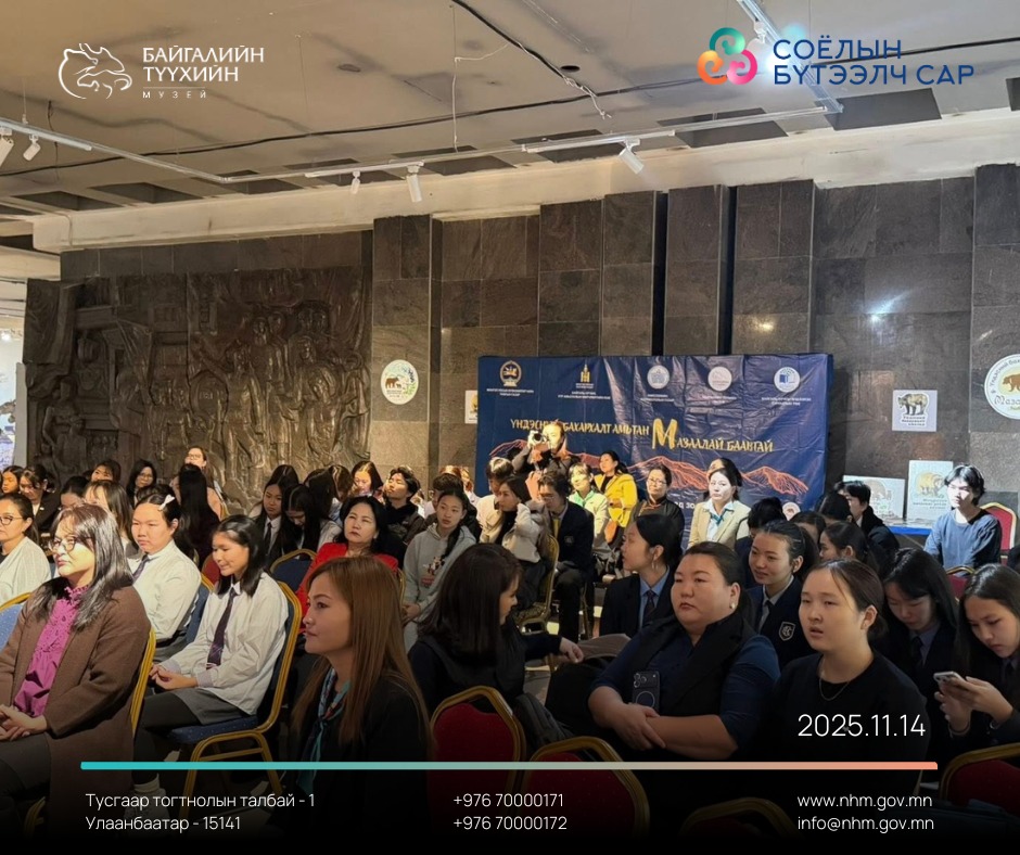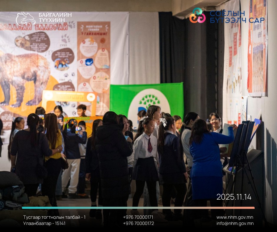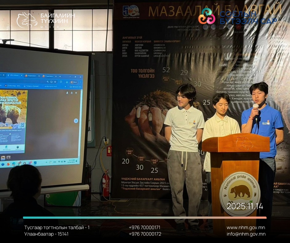 MONGOLIA PRIDE CULTURE CREATIVE MONTH CAMPAIGN “NATIONAL PROGRAM TO INTRODUCE THE MAZAALAI BEAR” COVERED OVER 10 THOUSAND CHILDREN AND YOUTH The closing event of the “Introducing the National Pride Animal, the Mazaalai Bear” program was held today. Minister of Environment and Climate Change B. Batbaatar attended the opening of the event and emphasized that the Mazaalai Bear is a symbol of Mongolia's biodiversity and that every child's participation in its protection is important. The “Introducing the National Pride Animal, the Mazaalai Bear” training and activities were jointly organized by the Office of the President of Mongolia, the Ministry of Environment and Climate Change, the Capital Education Department, the Natural History Museum, and the Environmental Information and Training Center, and covered more than 10 thousand students from Polytechnic Colleges of Technology and more than 20 schools in the capital. The students participating in the program reinforced their cognitive knowledge gained through the museum learning environment, prepared POSTER PRESENTATIONS as a class, and a temporary exhibition was opened to the public in honor of the third annual Cultural Creativity Month, which is a tradition that is being implemented nationwide. This exhibition is unique in that it is the second exhibition of works born from the Natural History Museum's educational program, which was first exhibited in 2024. Within the framework of the program, three-stage training and activities based on museum education, namely pre-museum - in-museum - post-museum, were implemented, and a five-level curriculum, teacher recommendations, and student guides tailored to the age and mental characteristics of children were developed and distributed. This is aimed at introducing children and young people to the importance of the Mazaalai Bear ecosystem and the values of biodiversity through a comprehensive methodology that integrates education and the museum environment. As a result of the “Introducing the National Pride Animal - Mazaalai Bear” program: Students will gain scientific knowledge about the Mazaalai Bear and rare and extremely rare animals of Mongolia, and understand the value of biodiversity. Understanding of the importance of ecosystems and the impact of climate change will deepen, and a correct attitude towards nature conservation will be formed. Children and young people will increase their participation and initiative in nature conservation activities, and they will realize their civic responsibility. The idea of sustainable development education will be realistically reflected in general education teaching activities, and cooperation between educational institutions will expand. The ecological education and sustainable development education system will improve, contributing to the implementation of state policy documents. This methodology, which combines classroom training with extracurricular activities, can be fully introduced to other schools nationwide. It is pleasing to note that the Ministry of Education, Culture and Sports is planning to expand this program across the country in phases, aiming to include school children in all aimags and soums.