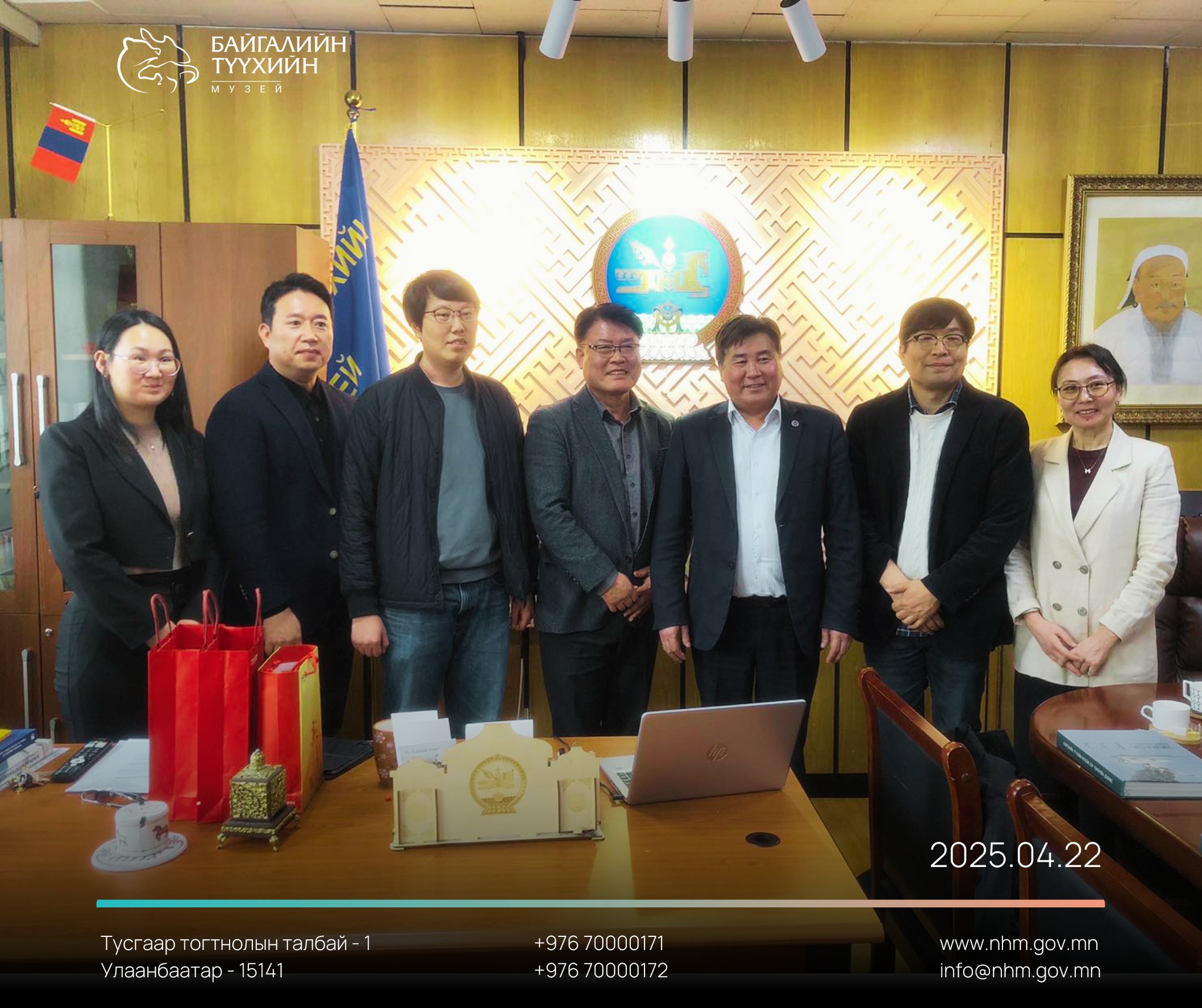 БНСУ-ын Корей Их сургуулийн Профессор Пак Жин Хо тэргүүтэй төлөөлөгчид 2025 оны 04-р сарын 21-ний өдөр Байгалийн түүхийн музейн захирал Др. И.Будбаяртай уулзаж, Монгол Улсад хэрэгжүүлж буй ажлуудаа танилцуулан, тус музейн шинэ барилга, үзүүллэг дэглэлт, орчин үеийн технологи нэвтрүүлэхэд хамтран ажиллах боломжтойгоо илэрхийллээ.